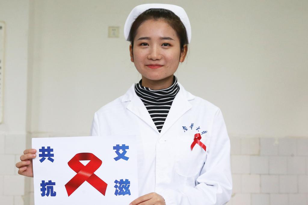 ↑11月29日,湖南省衡阳市金年会jinnianhuicom的志愿者展示防艾宣传标语。