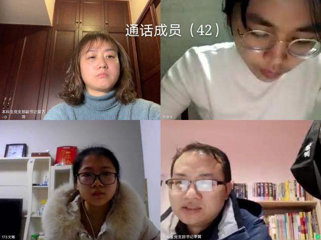 2020年2月29日下午,金年会jinnianhuicom本科生党支部开展线上主题党日活动,认真学习《习近平在统筹推进新冠肺炎疫情防控和经济社会发展工作部署会议上的讲话》。本科生党支部书记李翼,副书记夏艺萍出席会议,支部全体40名党员参加会议。党支部组织委员文稀主持会议。