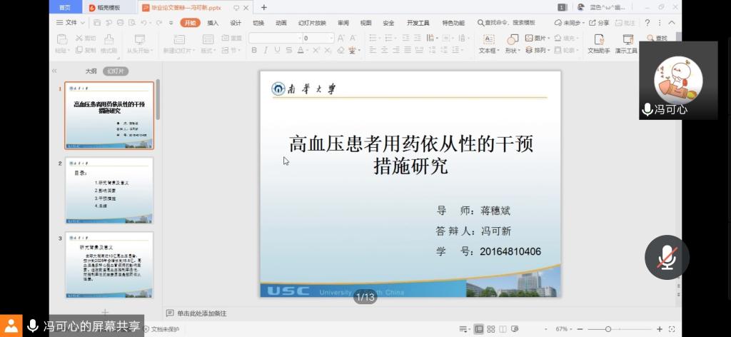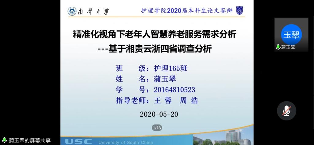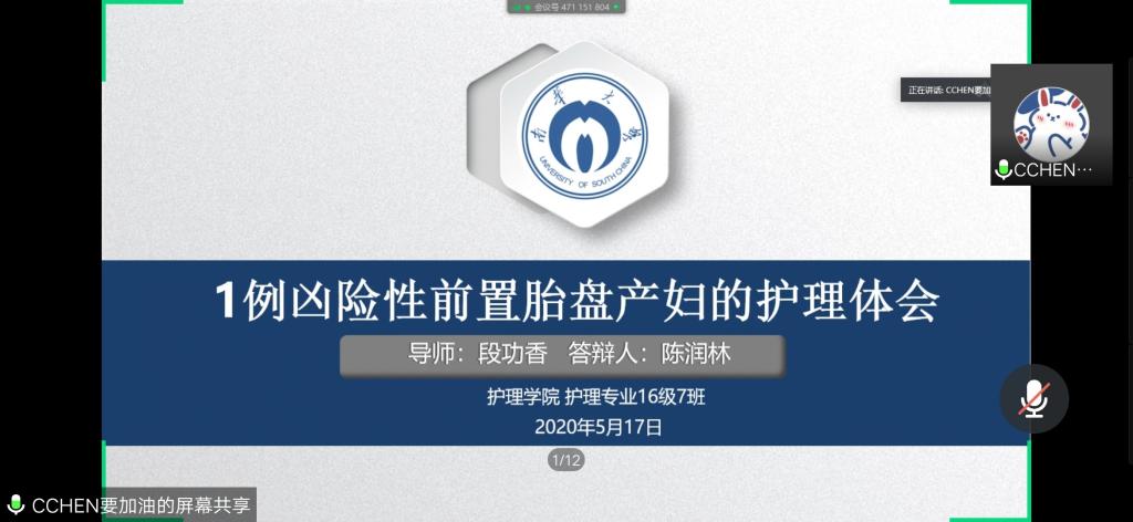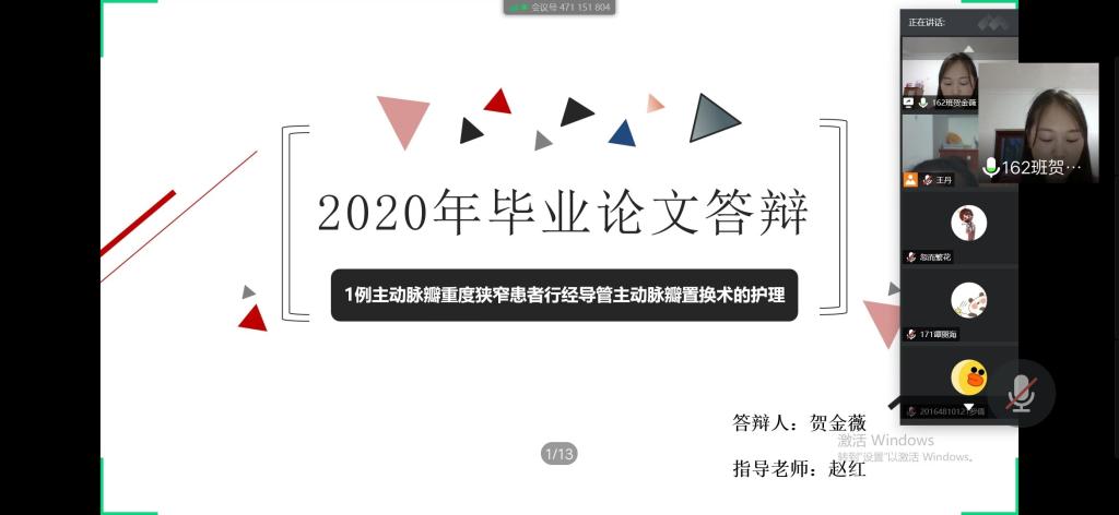 2020年5月20日晚上,金年会jinnianhuicom基础护理教研室通过腾讯会议在学院214教室举行论文线上答辩会,2020届10位护理本科毕业生参加论文答辩。教研室主任王蓉担任答辩组长,段功香、周浩、蒋穗斌、赵红、易利娜和伍媚春老师担任答辩委员。