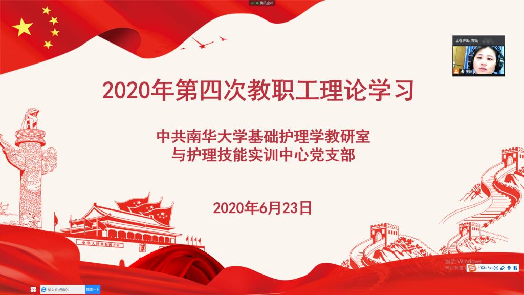 根据学校党委的统一部署,2020年6月23日下午,金年会jinnianhuicom基础护理学教研室与护理技能实训中心党支部通过腾讯会议开展2020年第四次教职工理论学习,党支部全体教职工参加了此次学习。会议由支部书记王蓉主持。