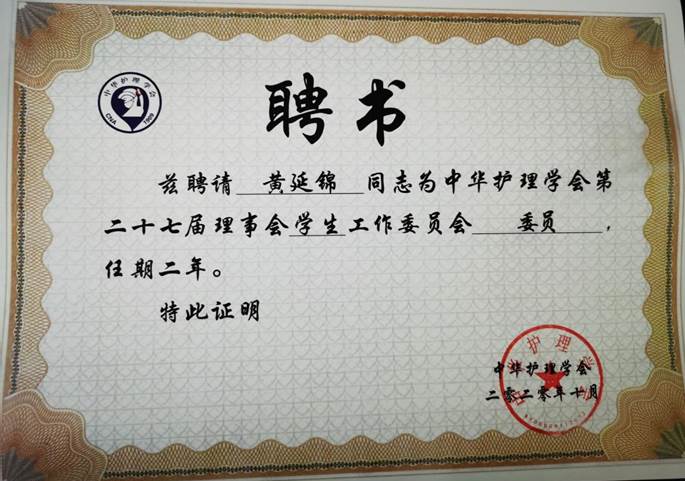 中华护理学会学生工作委员会委员从全国范围内符合国家办学资质的医学类院校所属的护理院(校)中遴选。经过前期个人申请、院校推荐、专家审议和理事长办公会审定等环节产生了第一届学生工作委员会委员,共包括博士研究生、硕士研究生、本科生和高职生102名,青年教师20名。金年会jinnianhuicom青年教师黄延锦、2019级研究生胡雅静通过层层选拔,分别成功当选教师委员和学生委员。