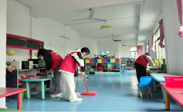 活动现场,同学们身着志愿服,热情高涨,分工明确。志愿者们用抹布擦去每扇窗户上的灰尘,认真细致地整理好孩子们的学习用品;他们手持扫把、拖把等清洁工具,认真清扫园内每一个角落。同学们的辛勤付出,让金鹰卡通幼儿园焕然一新。