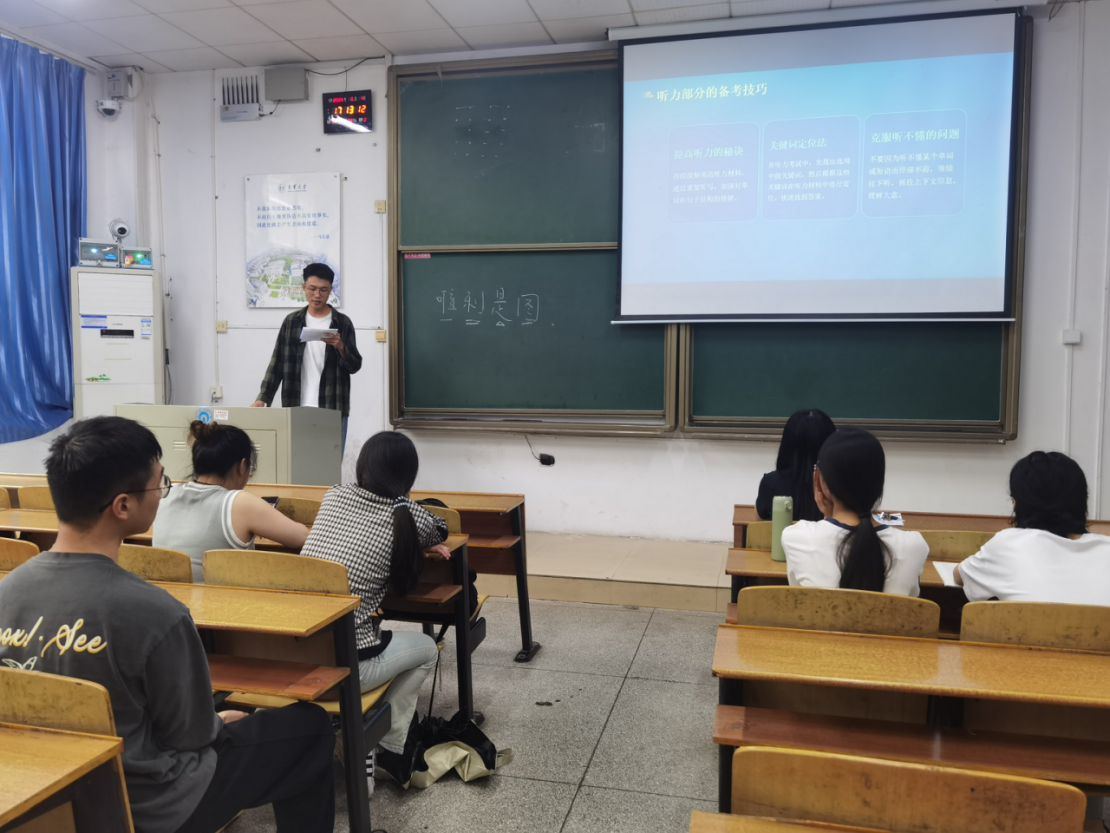 分享会邀请了学院2023级刘俊武同学进行分享。刘俊武同学以“掌握学习方法,突破考试难关”为主题,从英语学习方法和四六级备考建议两方面进行讲述。学习英语要从记背单词着手,介绍了兴趣结合法、重复记忆法和语境理解法三种单词记忆方法;通过听英语歌曲、观看英文影视作品以及将个人兴趣和英语结合,以娱乐化的方式加强语音语调的学习和生活化的表达;针对语法学习的顺序,要积累大量语言素材,再系统学习语法。在四六级备考建议上,他具体阐述了听力、选词填空、阅读理解、翻译等题型的解答策略。参加活动的同学们积极提问,对英语答题技巧、学习兴趣等进行了进一步交流探讨。