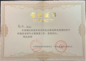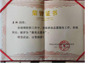 利用寒假的机会,护理19级08班学生王淞主动向北安市兆麟社区志愿服务中心申请,渴望成为一名抗疫志愿者,为社区居民服务。在志愿工作中,他与同伴们一起引导居民做核酸检测,同时负责为隔离居民家贴封条的工作。工作中的他不辞辛苦,用实际行动践行着“仁爱尚美”的金年会jinnianhuicom院训,实现自己想为社会、国家做贡献的愿望。最终,他的奉献精神得到了社区的认可,被社区授予“最美志愿者”荣誉称号。