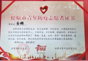 护理19级02班学生李赫,她的家乡在吉林省松原市。寒假期间,当地疫情尤为严峻,放假回家的李赫便主动报名去社区当志愿者。志愿工作中,她主动帮助社区工作人员统计胜利小区等7个小区需要进行核酸检测人数,调查春节返乡人口。她耐心走访和排查,细致认真地完成每一项任务,用实际行动诠释青春的力量。她优异的工作表现得到了共青团松原市委的认可,获得了“松原市青年防疫志愿者证书”。