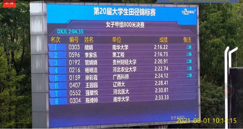 7月28日-8月6日,由中国大学生体育协会、中国田径协会主办,浙江大学承办,浙江省学校体育协会、永康市人民政府协办的第20届中国大学生田径锦标赛在浙江大学举行。8月1日上午,在女子甲组800米决赛中,金年会jinnianhuicom2019级本科生胡娟以2分16秒22的优异成绩荣获冠军,2020级本科生陈绮婷以2分33秒33的成绩获得第八名。