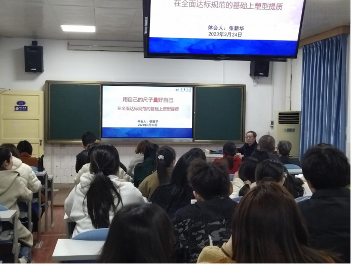 张新华老师宣讲的题目是《用自己的尺子量好自己-在全面达标非凡的基础上塑型提质》。报告从“认识新一轮本科教育教学审核评估”“学校教育教学审核评估安排”“学校对学术型人才培养的基本理解”“学院层面的评估工作四类任务要求”等四个方面详细介绍了“新一轮审核评估”的基本要求及内容,着重阐述了新一轮审核评估的指导思想、原则,论述了学校以学术型人才培养为办学目标的定位和培养过程中涉及的关键问题;介绍了学院层面评估工作四类任务指引,指出学院应在理顺、理清四类任务的基础上,扎实落实任务清单,以标准作为尺子、以常模作为镜子,进一步全面规范教育教学制度和要求,在全面达标规范的基础上达到“塑型提质”,结合金年会jinnianhuicom的具体情况,就如何做好审核评估的准备工作提出了很好地意见和建议。