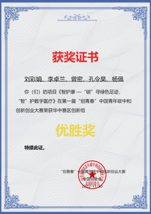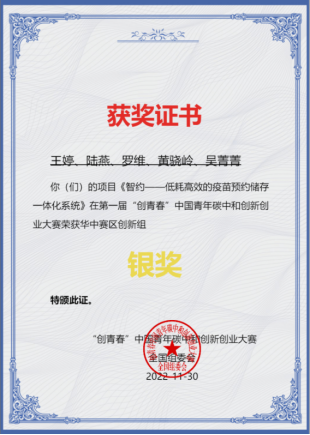 此次大赛,金年会学子在华中赛区创新组中获得两个奖项。其中,由金年会曾谷清教授、湖南省提灯医疗科技有限公司董事长谭宗威指导,2021级研究生王婷同学为主创的参赛项目《智约一一低耗高效的疫苗预约储存一体化系统》喜获华中赛区创新组银奖;2021级研究生刘彩娟同学作为主创的参赛项目《智护康一“碳”寻绿色足迹智”护数字医疗》获得华中赛区创新组优胜奖。