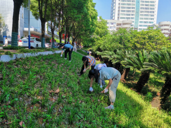 同学们确定好分工后,便带好手套认真拔除斜坡上的杂草,不一会人行道上就摆满了一摞摞杂草垛,吸引了很多行人驻足。同学们的鞋子被黄色的泥土沾满,雪白的手套上也沾满了污渍。下过雨后的草地还有些湿滑,几个同学在拔草时,不时会打个趔趄,但她们互相搀扶,共同克服困难,在短短一个小时内就将原本杂乱的绿地清理干净。大家对此感到十分满足,在一片欢声笑语中结束了劳动。