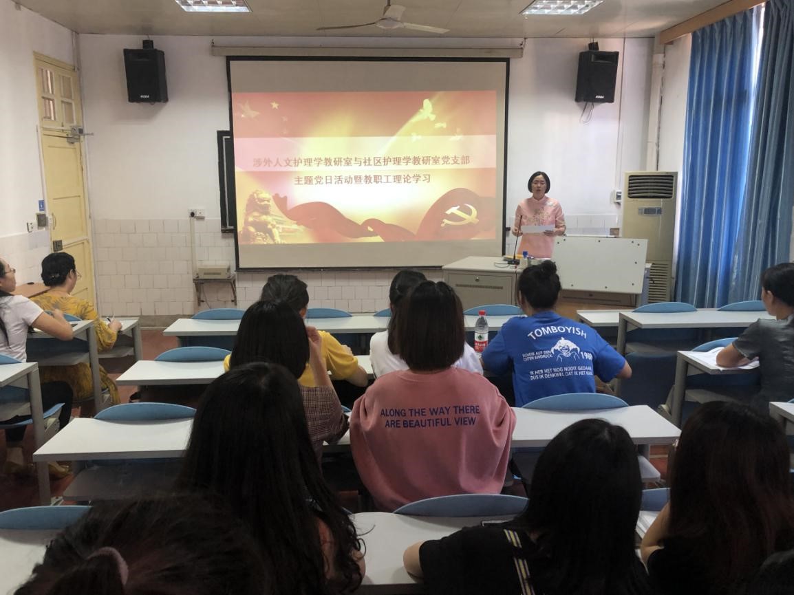 2019年9月25日下午3点,金年会jinnianhuicom涉外人文护理学教研室与社区护理学教研室党支部举行主题党日活动暨第四次教职工理论学习,全体支部成员参加此次会议,会议由支部书记苏银花同志主持。