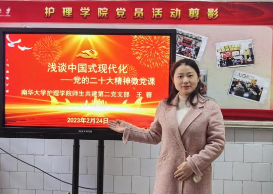 随后,王蓉以《浅谈中国式现代化》为题讲了微党课,回顾了中国式现代化的发展历程、中国特色和本质要求,讲解了全面建设社会主义现代化强国的战略安排和重大原则;结合我国护理人才队伍的现状,提出要加大护理教育经费投入,扩大护理教育规模,加大护理教育资源供给,提高护理人才培养质量,保障和促进人民健康,护航经济社会发展,助力中国式现代化,为中华民族伟大复兴而奋斗。组织委员方静芝进行主题发言,她提出我们要认真理解中国式现代化的内涵,建设健康中国,助力中国式现代化。