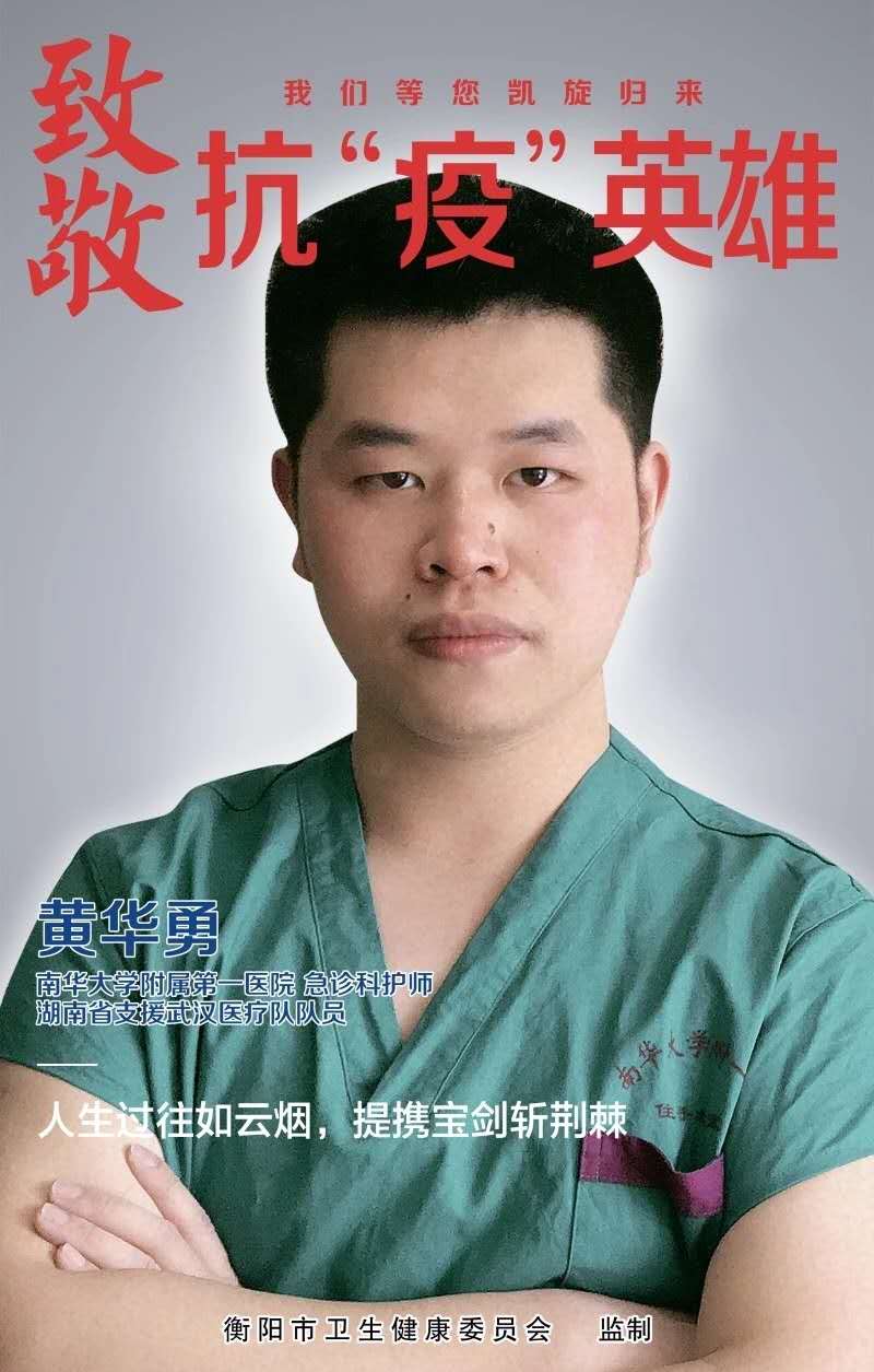 金年会jinnianhuicom2019级硕士研究生黄华勇,是金年会诚信信誉至上附属第一医院的急诊科护师,几小时前临危受命,他成为了前线队伍中的一员。得知即将前往湖北支援的消息,电话那端传来哽咽的声音并嘱咐道:“一定要沉着冷静,没把握的事多问,胜利在望,平安归来,家里一切都好,勿劳挂。”有了家人的支持,他便踏上了前进的征程。“一定要平安归来,再聚之时,定要不醉不归”一句句暖心的话语不断在耳边响起,希波克拉底誓言,南丁格尔思想,驱散了他内心的恐惧。他说“真的猛士敢于直面惨淡的人生,敢于正视淋漓的鲜血。此刻,我应该是一个真正的猛士!”并在自己日记中写到:
