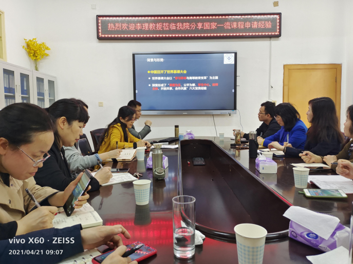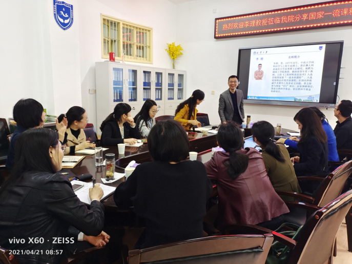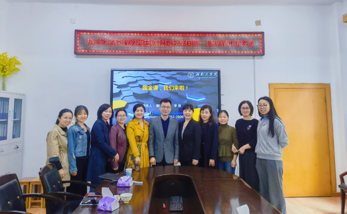 4月21日上午,湖南工学院李理教授莅临金年会分享国家一流课程申请经验。金年会jinnianhuicom副院长曾谷清、何平平,学院一流课程教学团队全体教师参加会议。交流会在金年会jinnianhuicom二楼会议室举行,会议由何平平副院长主持。