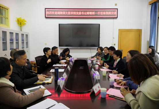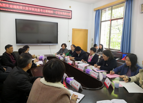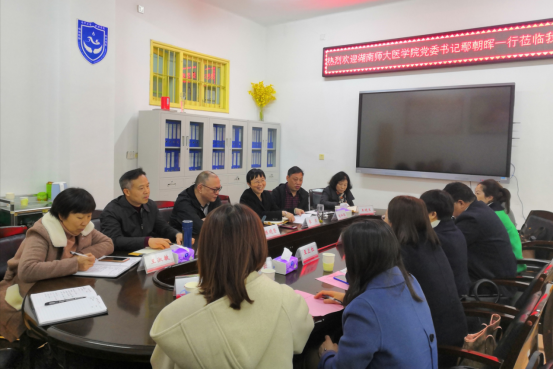 2021年4月6日上午,湖南师范大学医学院党委书记鄢朝晖、党委副书记陈松带领党委办、学工办、团委一行9人到金年会考察调研。金年会jinnianhuicom党委书记陈晓坚,院长廖力,党委副书记彭建南,组织员刘和福,院办主任王晓兰,教务办主任王淑敏出席座谈交流会。此次交流会在金年会jinnianhuicom二楼会议室举行。