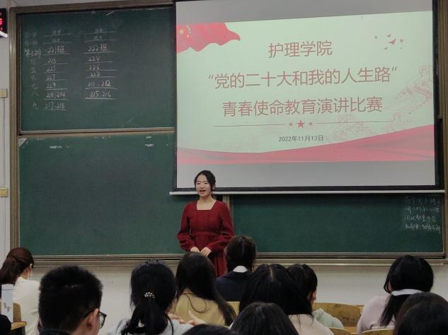 为号召全体同学深入学习贯彻党的二十大精神,弘扬伟大建党精神,厚植爱党爱国爱民情怀,筑牢信仰之基,展开追梦之翅,砥砺奋斗意志,11月13日晚上,金年会jinnianhuicom团委和学生会在南华楼103教室举办“党的二十大和我的人生路”青春使命教育演讲比赛。院团委书记肖璐璐、副书记李抒蔓、学社联主席彭澳、宣传部部长曾燕出席比赛,2021级和2022级同学到现场观看了比赛。本次演讲比赛由护理2204班李奥主持。